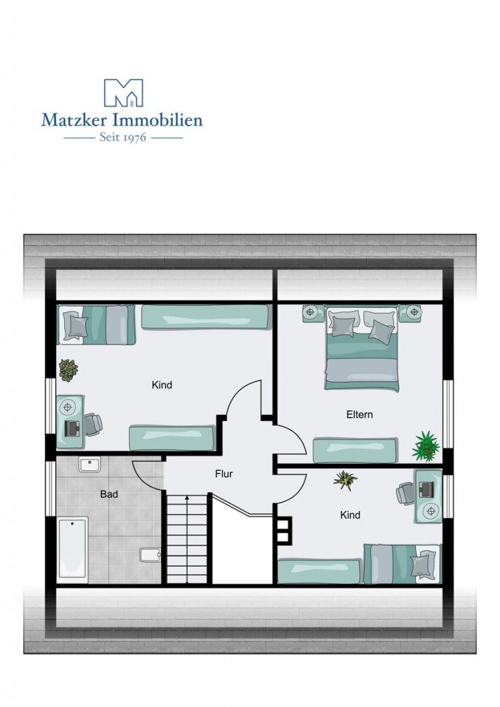 Im Dachgeschoss stehen drei gut geschnittene Schlafzimmer zur Verfügung, darunter ein Elternschlafzimmer sowie zwei Kinderzimmer. Ein Tageslichtbad mit Badewanne komplettiert diese Etage und sorgt für eine angenehme Aufteilung für den Familienalltag.