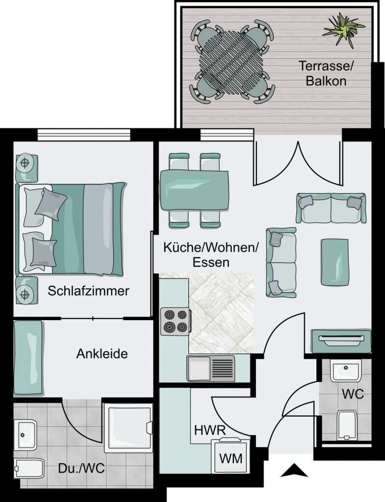 Die Wohnung befinden sich in einem Mehrfamilienhaus mit insgesamt 11 hochwertigen Wohnungen. Die Wohnung im 1. Obergeschoss ist optimal aufgeteilt und bietet ein helles Wohn-/Esszimmassener mit offener Küche (mtl. 35,00 €), Flur, Schlafzimmer, Bad mit bodengleicher Dusche, Hauswirtschaftsraum mit Platz für Waschmaschine, Trockner und zusätzlicher Abstellfläche, sowie ein Gäste-WC. Als zusätzliches Highlight gibt es einen an das Wohnzimmer angrenzenden Balkon. Der zur Wohnung gehörende Kellerraum bietet ca. 6 m² zusätzliche Nutzfläche zum Lagern. Das Auto stellen Sie auf dem eigenen Tiefgaragenstellplatz (mtl. 60,00€) ab, für Fahrräder steht ein ausreichend dimensionierter Fahrradunterstand zur Verfügung.