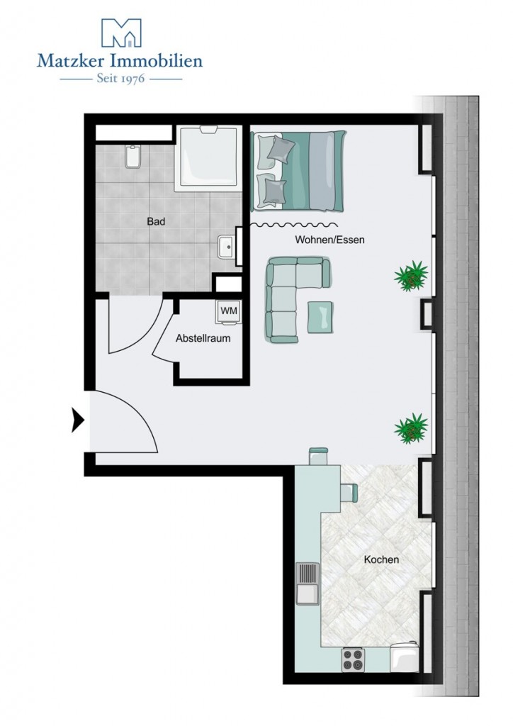 Der Schlafbereich kann geschickt abgetrennt werden und sorgt für eine klare Raumstruktur sowie ein angenehmes Wohngefühl. Das modern ausgestattete Badezimmer verfügt über eine bodengleiche Dusche und hochwertige Sanitärobjekte. Ein praktischer Abstellraum innerhalb der Wohnung ergänzt das Raumangebot sinnvoll.