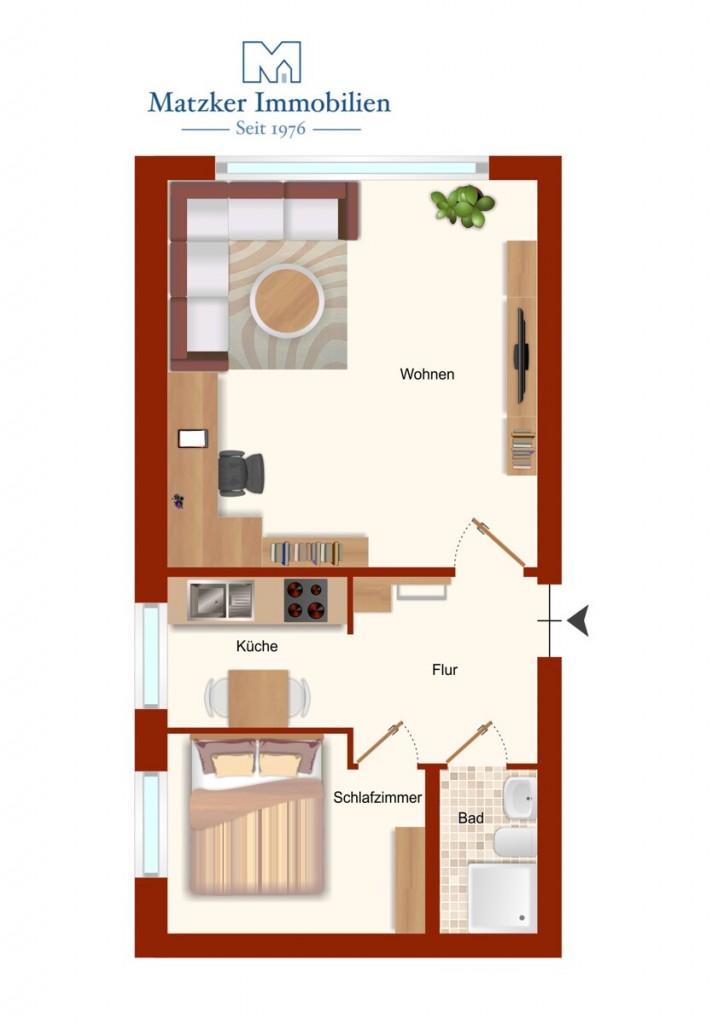 Über den Flur im Eingangsbereich gelangt man zur linken in das Badezimmer mit Dusche, WC und Waschbecken. Darüber hinaus verfügt die Wohnung über ein Schlafzimmer, eine Küche und ein geräumiges Wohnzimmer.