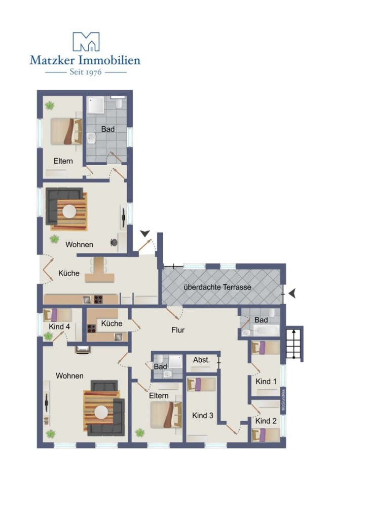 Die zweite, großzügigere Wohnung mit ca. 105 m² Wohnfläche bietet eine familienfreundliche Aufteilung. Vom Eingangsbereich aus erschließen sich drei Kinderzimmer sowie ein Badezimmer mit Badewanne und Dusche. Im weiteren Verlauf gelangen Sie in die Küche sowie in das Wohnzimmer. Ein weiteres Zimmer steht flexibel als Kinder-, Arbeits- oder Gästezimmer zur Verfügung. Zu dieser Einheit gehört zudem eine überdachte Terrasse mit angrenzendem Gartenbereich. Diese Wohnung befindet sich derzeit in einem renovierungsbedürftigen Zustand und bietet entsprechendes Potenzial für individuelle Anpassungen.